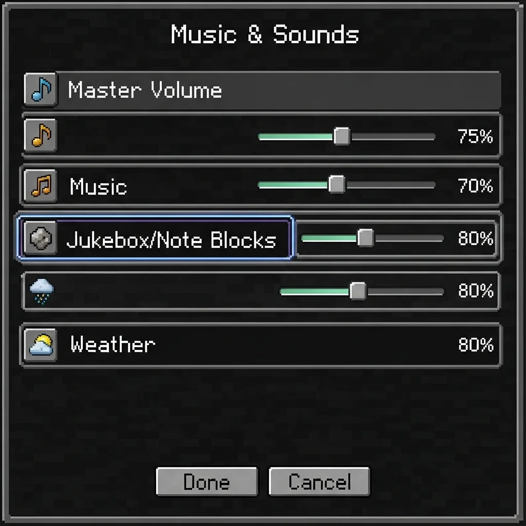 - Turn Minecraft’s ‘Players’ volume to 100% and lower music and ambient sounds to zero for clarity.